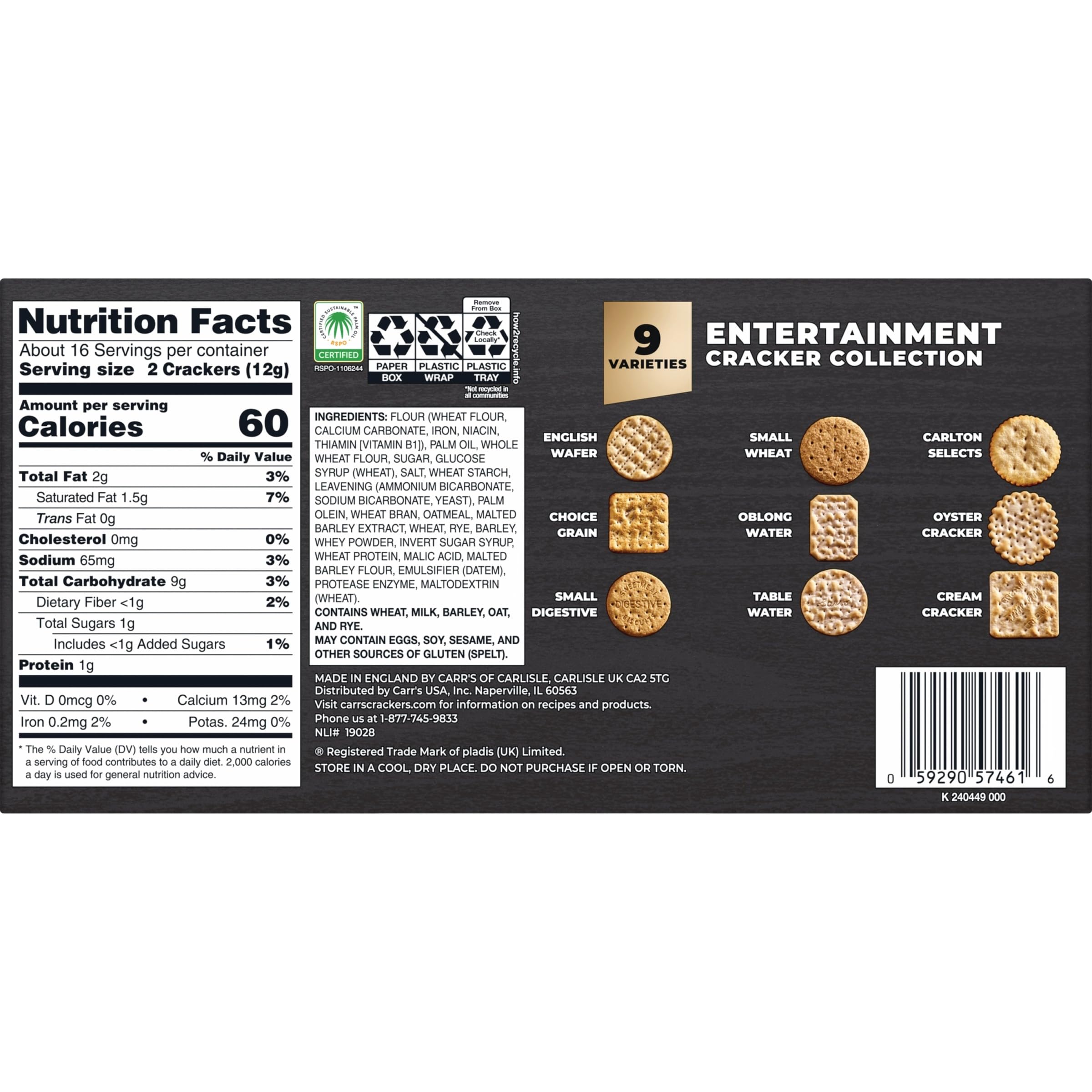 - Includes 1, 7.05-ounce box containing English Wafer, Choice Grain, Small Digestive, Small Wheat, Oblong Wafer, Table Water, Carlton Selects, Oyster, and Cream crackers