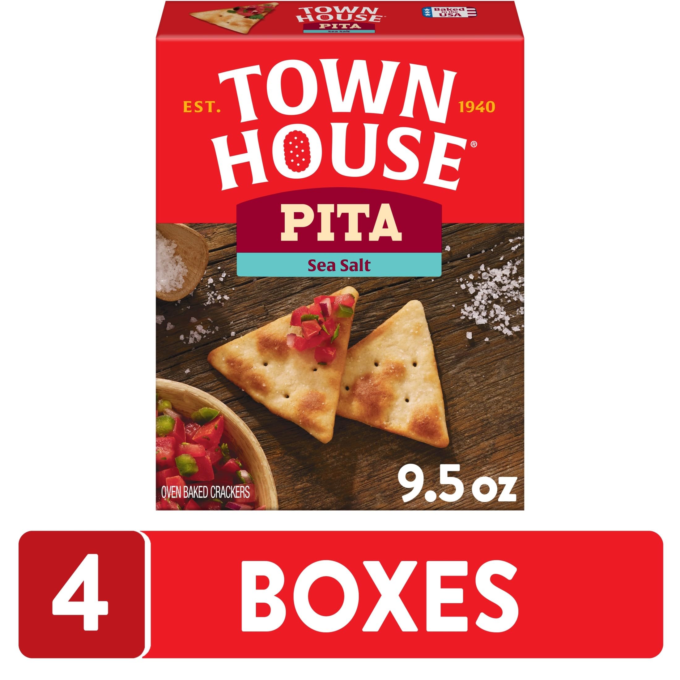 - Includes 4, 9.5oz boxes of ready-to-eat Town House Pita Crackers Sea Salt; Packaged for freshness and great taste